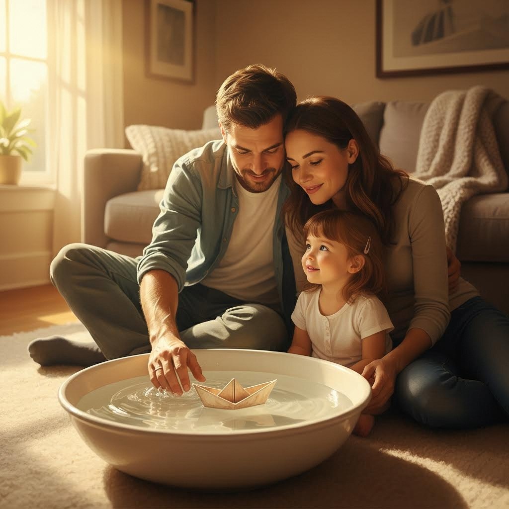 Папа, услышав плеск, первым подошел к ней и, забыв о сквозняке, стал наблюдать, как кораблик кружит по воде. Мама вышла из спальни и, не желая испугать это чудесное мгновение, присоединилась к ним.