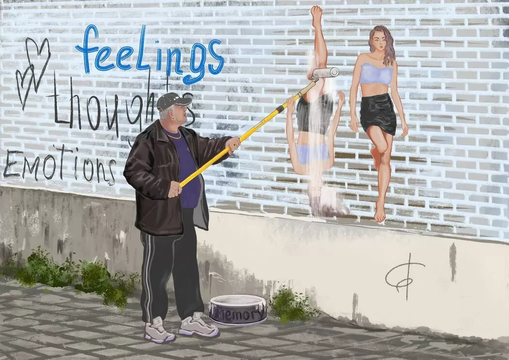 Фигура мужчины с валиком и девушка, исчезающая под слоем краски, олицетворяют собирательные образы клиентов: их боли, защитные механизмы и немые крики. Это картина, названная «Белая ложь», передает то, что происходит в душе, когда мы пытаемся скрыть свои настоящие чувства.