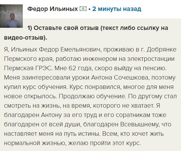 В 62 года, когда многие переходят на пенсию, Федор решил по-новому взглянуть на жизнь. Курс Антона Сочешкова открыл перед ним двери к саморазвитию и новым знаниям. "Я продолжаю обучение" — делится Федор, подчеркивая, как пройденный курс изменил его восприятие времени и жизни в целом.