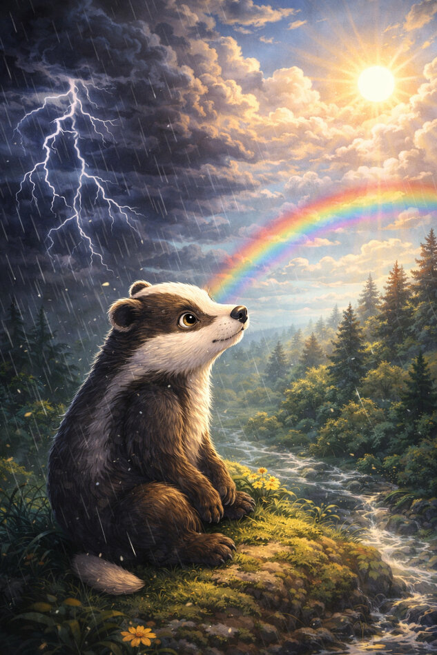 В таинственных глубинах леса, накрытого утренней дымкой, жил-был барсучонок по имени Мирон. Несмотря на то, что барсуки известны своей спокойной натурой, Мирон был немного другим: его настроение менялось, как весеннее небо.