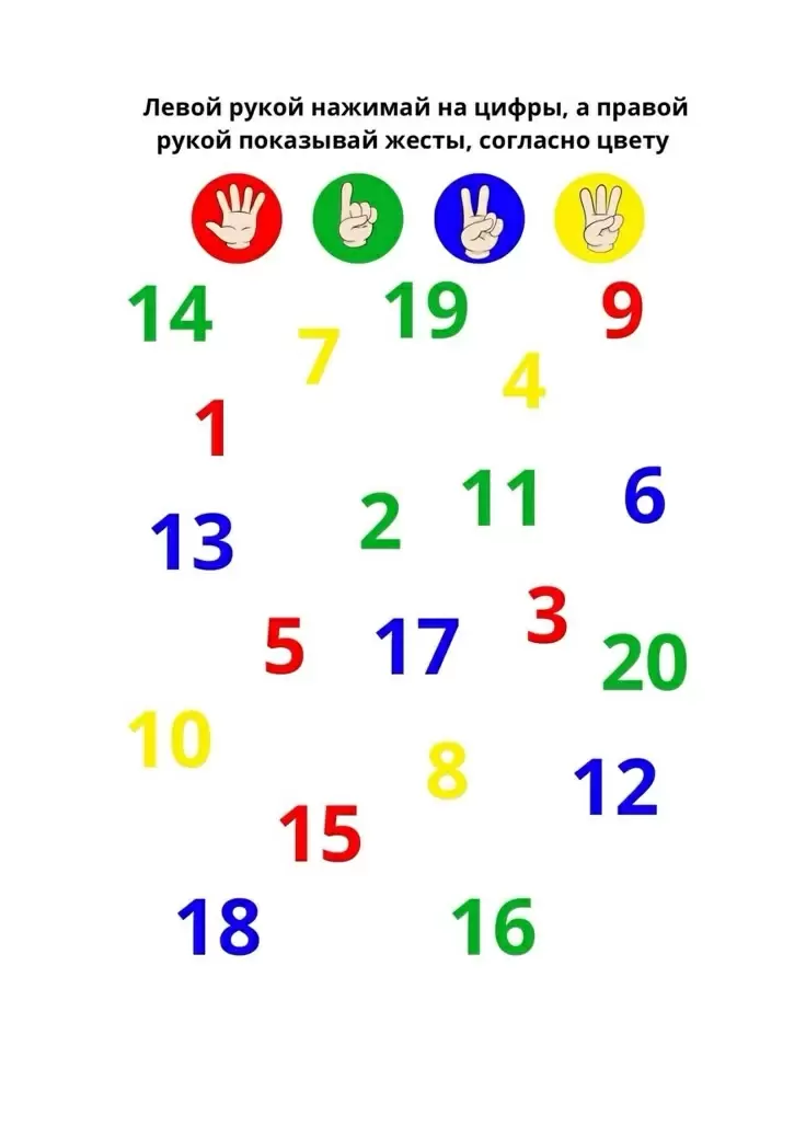 Предлагаемый метод кажется простым: одновременно одной рукой нажимать на цифры, а другой - выполнять жесты определённых цветов. Однако для мозга это оказывается настоящим испытанием.